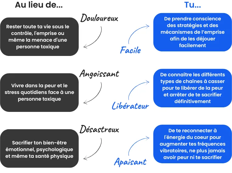 C’est possible parce que tu vas immédiatement comprendre et prendre conscience des mécanismes très subtils de l’emprise que tu subis et du degré d’emprise dont tu es victime. Tu vas connaître les différents types de chaînes à casser, ainsi que de la méthode énergétique la plus puissante pour sortir de toute forme d’emprise et te libérer de ton sacrifice face à une personne toxique.